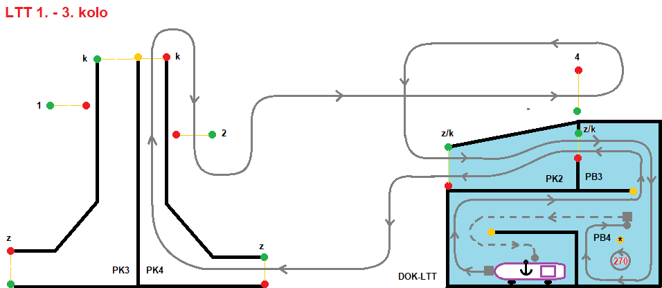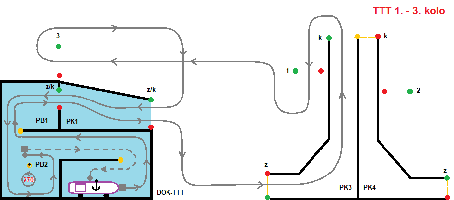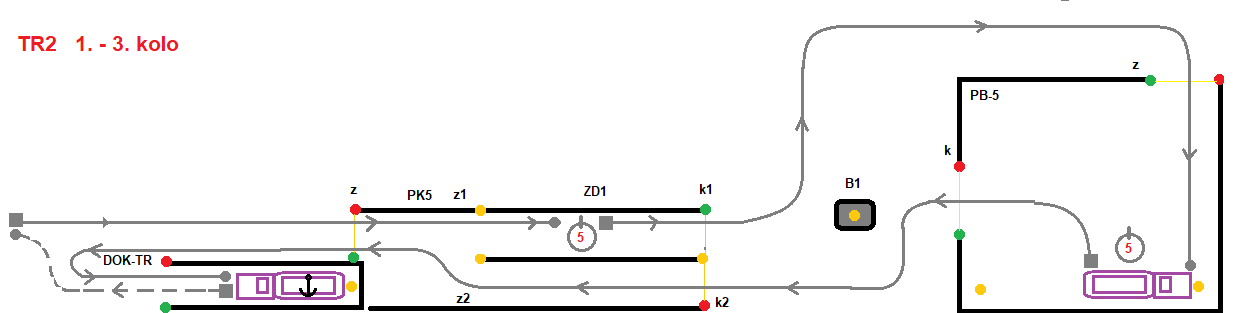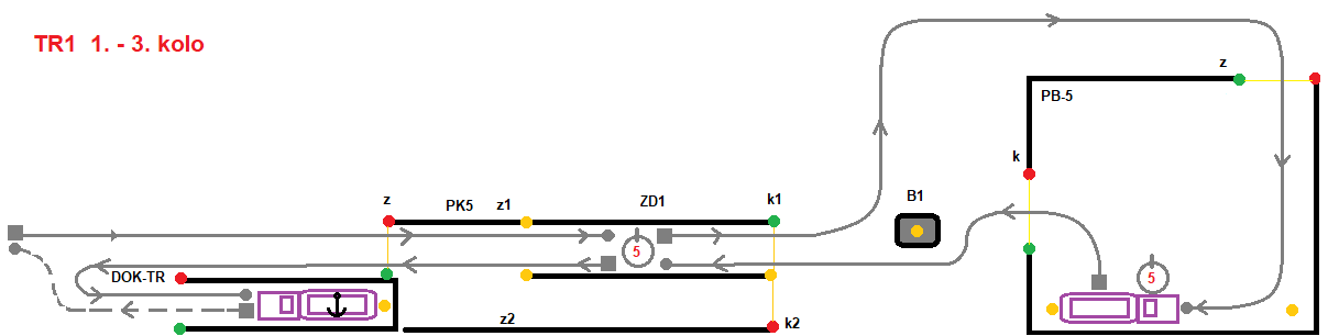 Soulodí vypluje z DOK-TR na zpětný chod. Poté provedu změnu směru plavby a přes zaústění z vpluje do PK5. Následně vpluje do ZD1 a zde provede manévr „Zdymadlo“ v délce 5 sekund. Po provedení manévru pokračuje v plavbě kolem bóje B1 a přes zaústění z vpluje do PB5, kde provede manévr „Přistání k bóji“ v délce 5 sekund. Bóje se musí dotýkat čelo soulodí. Po provedení manévru soulodí vypluje z PB5 přes zaústění k, mine bóji B1 a vpluje do ZD1 přes zaústění k1, kde provede manévr „Zdymadlo“ v délce 5 sekund. Po provedení manévru propluje PK5. Následně vpluje do DOK-TR, kde provede manévr „Přistání k bóji“ v délce 3 sekundy. Po provedení manévru soutěžní plavba končí.