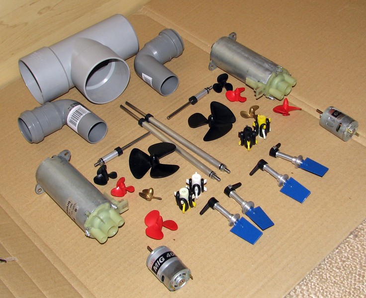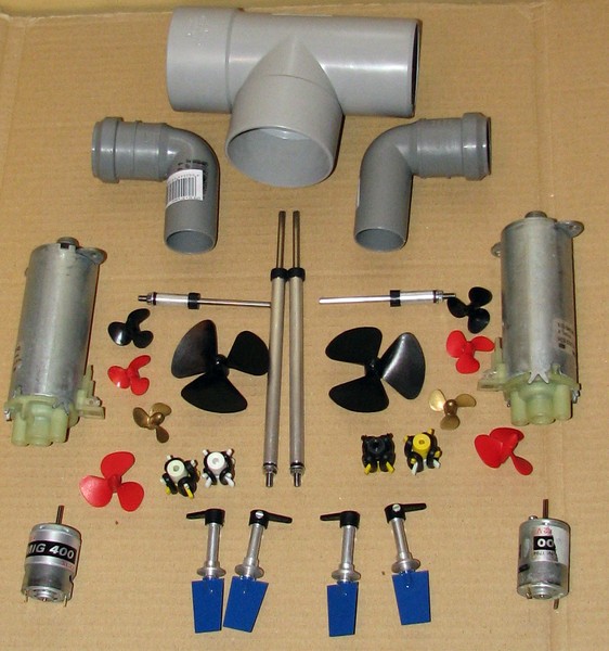 Když bylo rozhodnuto co a jak, bylo potřeba vše poshánět. Celkem tři hnací motory (jeden náhradní) mi dodal Bambinot (Petr Lukeš). Dva 56A regulátory jsem zakoupil u firmy DSys. Čtyři lodní hřídele jsem nechal vyrobit na míru u Admiralshopu. K nim jsem objednal i dva lodní šrouby o průměru 60mm a čtveřici kormidel. Materiál pro dýzy a příčné pohony jsem koupil v Bauhausu. Serva, přijímač (7 kanálů zn. Hitec), PB akumulátory a další drobnosti pochází z domácích zásob. Remorkér bude vybavený i funkčním pozičním osvětlením pomocí LED.