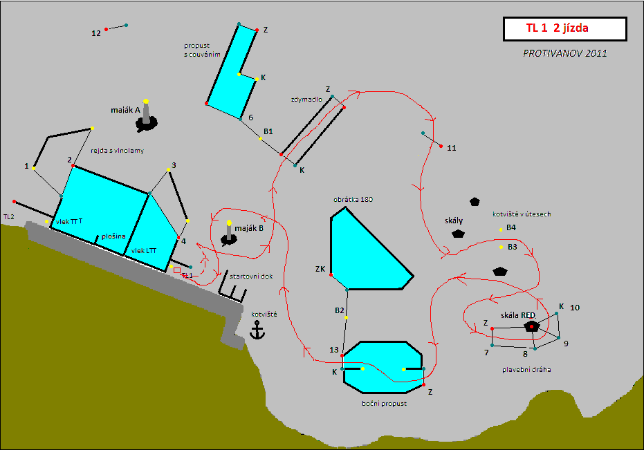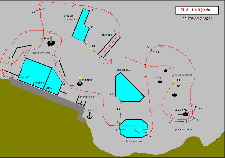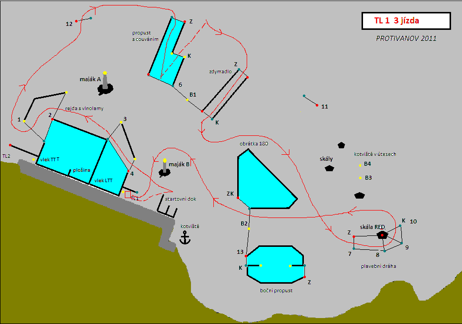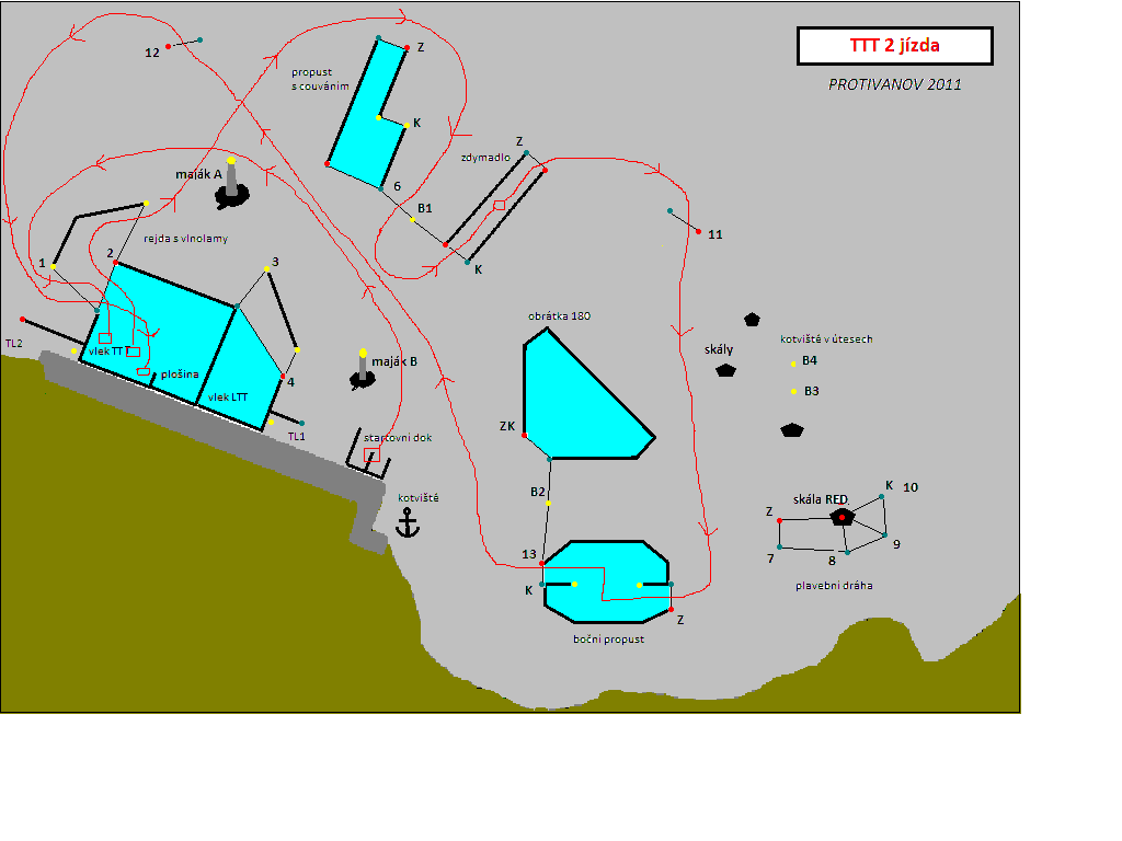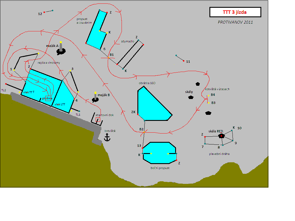 Dále brankou 13 (nerozhoduje jak mine středovou B2, ale celé soulodí musí proplout stejně), manévr obrátka 180, kurz kolem majáků A i B minout levobokem, branka 2, vplutí do přístavu, manévr přistání (pouze vlek se může/musí dotknout a to jen stěny zakotvené k hrázi). Konec.