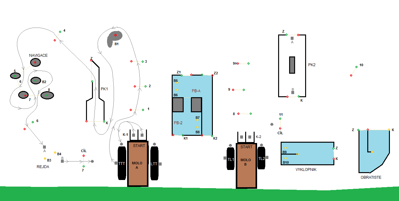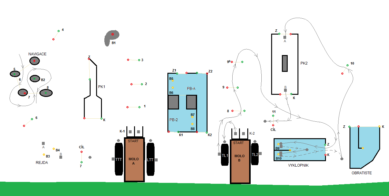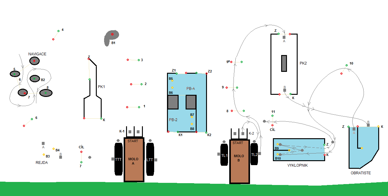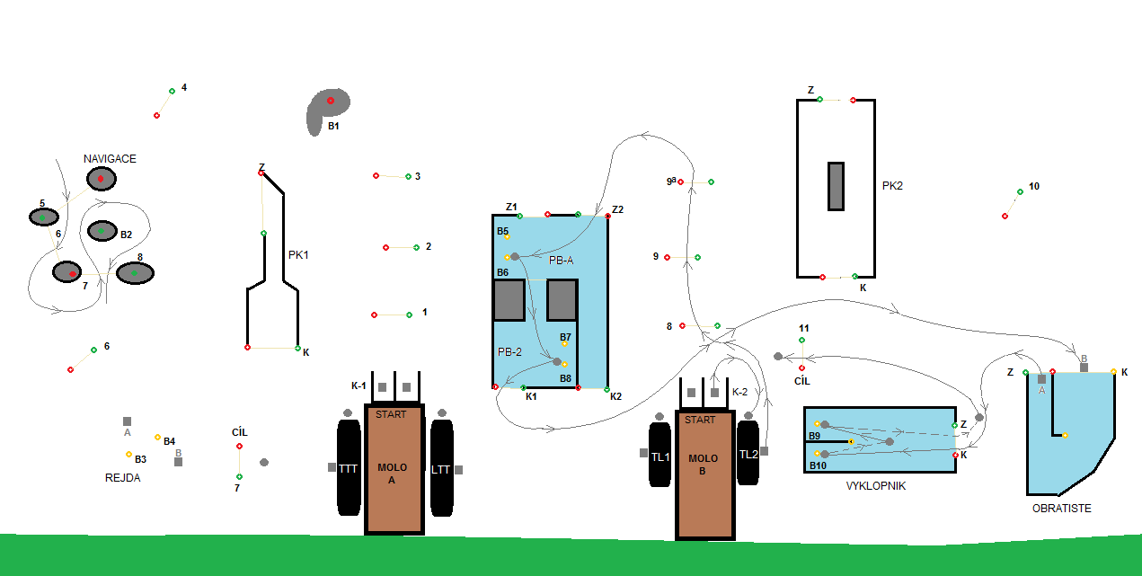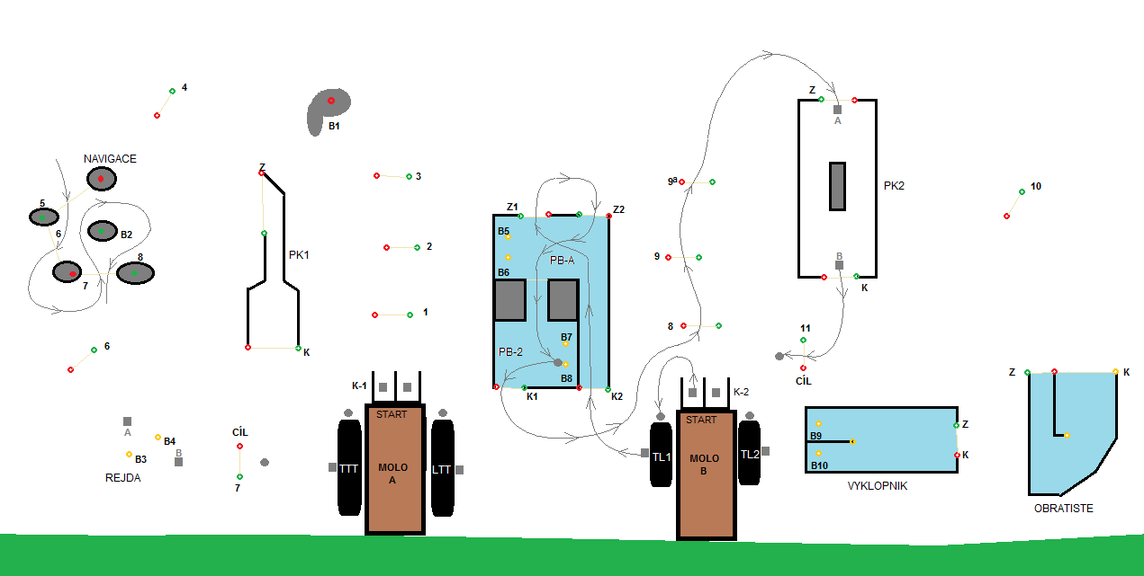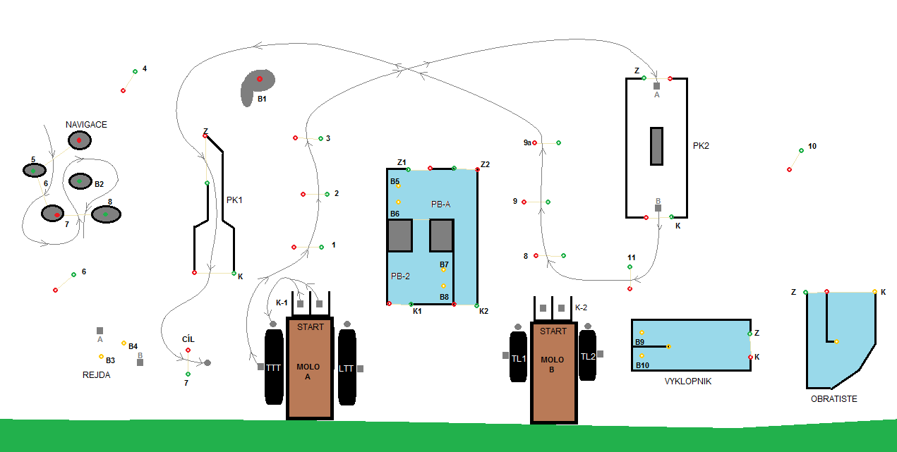 Druhé kolo. Soulodí propluje trať ve stanoveném kurzu. V bazénu PB-2 provede manévr „přistání k bóji“ u bóje B8. Bóje B7 se soulodí nesmí dotknout. Do plavebního kanálu PK2 vpluje zaústěním Z (bod A). Plavební kanál musí opustit zaústěním K (bod B). Jak kanál soulodí propluje je na volbě družstva. Cílovou brankou je branka č.11. Pro ostatní překážky platí stejná pravidla jak bylo uvedeno výše.