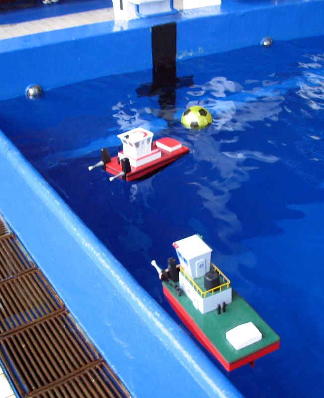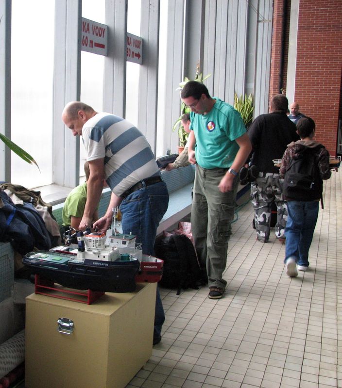 Museli jsme nejdříve vyřešit logistický problém, jak pár kousků našeho vybavení a dva vleky dopravit do Prahy a zase zpět. Dvojitá překládka vše vyřešila 🙂 V bazénu ČT pronajala od dvanácti do čtrnácti hodin dvě plavecké dráhy. V ostatních vesele plavala veřejnost. Plavci svými pohyby na hladině i pod hladinou vytvářeli naprosto nevypočitatelné a poměrně silné proudění vody doprovázené chaotickým vlněním. Modely se na hladině kolébaly jak kačeny ze strany na stranu a udžet je na místě vyžadovalo neustálé manévrování.