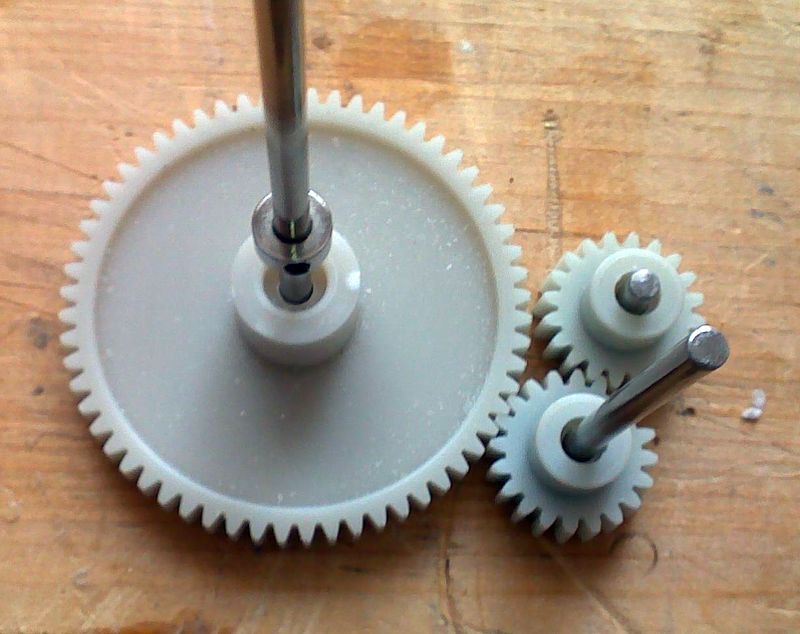 Stavba „hydrauliky“ kormidel se skládá z ozubených kol odlitých Jardou Jungmanem. Stejně jako u originálu je poměr úhlu otáčení dýza-kormidlo 1:3. Abych předešel zbytečné práci, složil jsem si převod „na sucho“ na pracovní desce, když vše chodilo tak jak má, hřídele ozubených kol jsem do desky zatloukl. Díry mi posloužily jako mustr na podložku převodů, podle které jsem vyvrtal díry pro pouzdra kormidel. Použil jsem pouzdra od Mp-jetu, kde jsem jen sundal plastový kroužek, jde svléknout navlečením trubičky a mírným poklepem na ni. Pod kroužkem je pouzdro zdrsněno a tak dobře drží v laminátu. Na zalepení zas přišel na řadu epoxid s plničem, tentokrát 30 minutový, kde jsem stále kontroloval úhel, po zavadnutí jsem nalepil desku mechaniky. Tato mechanika už dva roky bez poruchy běhá v Schuplikovi.