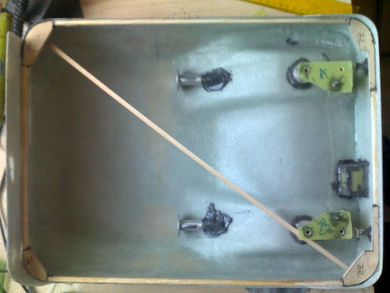 Pokusil jsem se o nápravu tím, že jsem do trupu přilepil vteřiňákem napruženou lištu 6×6, která trup narovnala a zalepil masivní rohy z překližky. Dále na dno trupu do protitahu jsem položil dvě lišty. Po vyjmutí napruženého hranolku, se trup srovnal. Dost jsem si oddechl. Protože pokřivení trupu bylo docela velké, musel jsem překontrolovat usazení hřídelí motorů. Obavy se splnily, šrouby frézovaly dýzy. Nezbylo nic jiného, než epoxid nahřát a pouzdra hřídelí vytrhnout a usadit znovu.