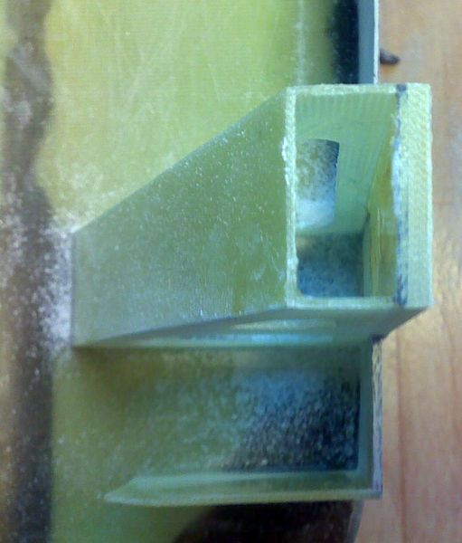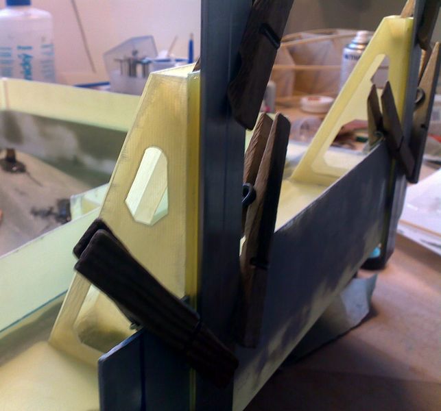 Trup byl nyní připraven na lepení koz. Při rozměřování jsem se rozhodl, že kozy vyrobím o nějaký milimetr širší, než by odpovídalo měřítku. Nestavím maketu (rád bych, ale bohužel to neumím), ale model na poježdění pro radost s přáteli a TT. Nejdříve jsem řídkou vteřinkou nalepil vyfrézovanou část na vnitřní stranu límce. Z vnějšku jsem nalepil na trup epoxidem pásek laminátu v délce, která odpovídá výsledné velikosti kozy. Mezera, která vznikla (síla trupu), byla vyplněna destičkami z laminátové desky. Vše jsem před lepením podrápal brusným papírem o zrnitosti 100 a odmastil lihem. Tak vznikla už 8. technologická přestávka.
