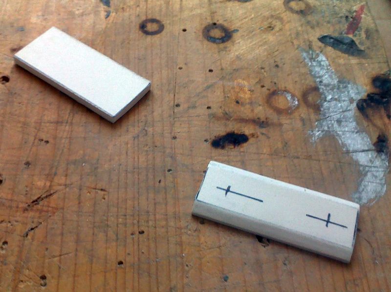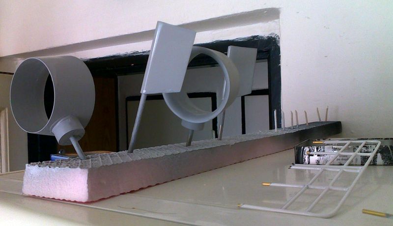 Abych se uklidnil něčím, co mi půjde líp, pustil jsem se do vykytování dýz a výroby kormidel. Dýzy jsem vytmelil nejjemnějším polyesterovým tmelem a přebrousil. Kormidla jsem se rozhodl vyrobit z tiskařského plechu, který ohnu kolem nerezové hřídele a mezeru vyplním Altecem. Podle papírové šablony jsem obyčejnými nůžkami vystříhnul plech, ve svěráku podle rysky v půli mírně ohnul a zbytek dotvaroval podle hřídele. Plech i hřídele jsem vykoupal v lihu a do mezery napatlal lepidlo, vše zajistil kolíčky na prádlo a hodinku počkal na zavadnutí. Když epoxid přestal lepit, tak jsem seřízl vyvřeliny a tím zároveň vysvobodil kolíčky.