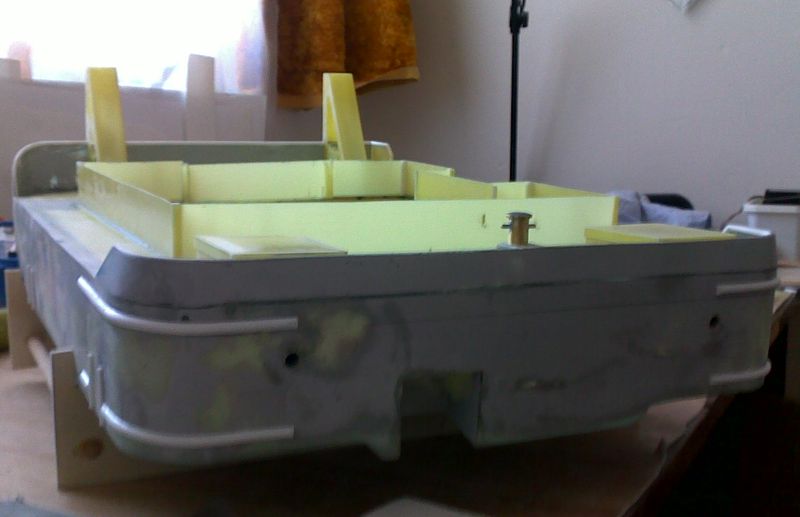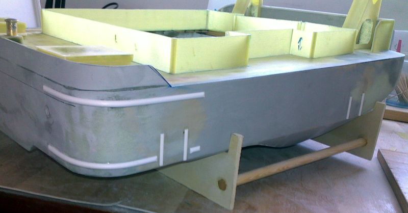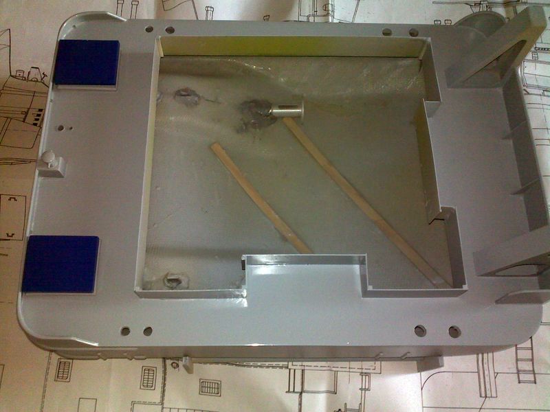 Podle fotek jsem si nakreslil úkos, který je po delších stranách a pilníkem na železo destičku upravil do požadovaného tvaru. Do takto upravené základny jsem vyvrtal, opět „na krev“, otvory pro pultry , které jsem k destičce zalepil vteřinkou. Není nutné, aby spoj byl nějak super pevný, protože pultry budou do trupu fixovány epoxidem. Následovalo vrtání paluby, kde v místě předních pultrů jsem svým oblíbeným Altecem, vlepil leteckou březovou překližku o síle 4 mm, aby rozložila tlaky naložené vany. Pultry jsem přeleštil smirkem 400 a dal do základu, na který přišla matná syntetika v černé matné. Uspokojen a namlsán výsledkem, fakt se mi ty pultry moc líbily, jsem usoudil, že když mi to s tím stříkáním tak jde, pustím se do lakování trupu.