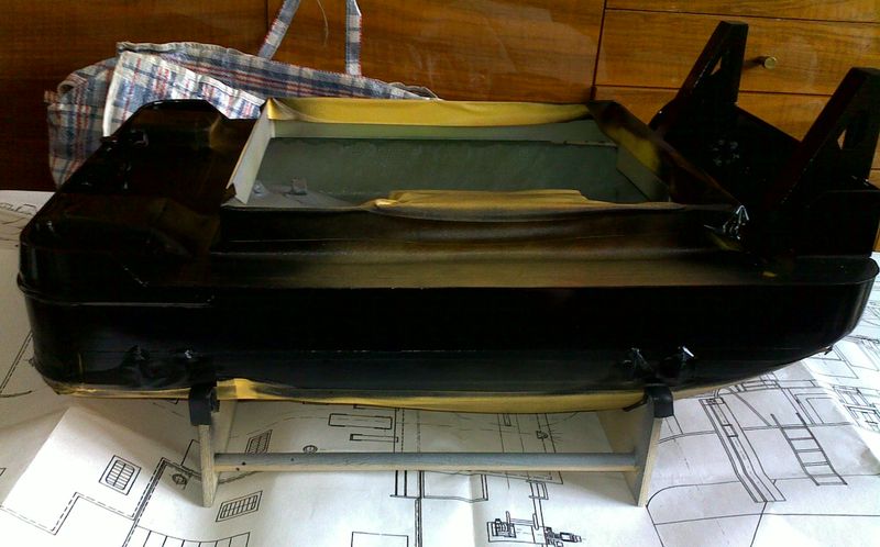 Zas jsem domaskoval trup, s modlením, aby páska nepodtekla. V obchodě se dušovali, že je to „nej“, co můžu koupit, také za hříšnou cenu 300,-Kč, by se měla snad aplikovat sama. Za svých „ideálních“ podmínek jsem přikročil k černé a poslední vrstvě laku. Jsem sám napnutý, jak to dopadne, až sejmu maskování a protože trup má vše (bezbarvý lak přijde až po nalepení vodoznaků z papíru), nevyhnu se už ničím stavbě nástavby, kde se pokusím vytvořit dojem žebrovaného plechu. Jen pevně doufám, že s lepším výsledkem, protože kladivo mám stále po ruce.:)