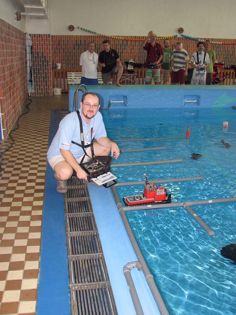 Kolem bazénu se toho dělo hodně, ale na mě se v lehkém TT s Monakem I. lepila smůla. Monako I. si snad poprvé od okamžiku co jsem ho spustil na vodu postavilo hlavu. Nejdříve jsem někde drbnul kormidlem, ohnul hřídel a kormidlo pak drhlo o lodní šroub. Bohužel to odnesl Ivvo, když jsem hostoval v jeho týmu NeJaToD. Monako I. se chovalo na vodě trochu bláznivě a body naskakovaly. Navíc jsem tahal soulodí, na což opravdu nejsem zvyklý. Horší byl ale důsledek mé páteční lenosti a ponechání Monaka I. v autě přes noc. Elektronika vymrzla a v tropickém klimatu bazénu se na ní začala kondenzovat vlhkost, která způsobila, že se regulátor resetl. Tím se vypnula elektronická brzda a nulová prodleva na neutrálu. Důsledky byly pro ovládání lodě víc než nepříjemné. Monako I. nemělo nikdy problém zastavit doslova a do písmene na místě a okamžitě začít couvat. Teď to trvalo minimálně jednu sekundu, což je neuvěřitelně dlouhá doba. Motor se navíc nezastavoval, takže i když jsem dal páčku plynu na neutrál, pořád to táhlo. Běs! Smůla je, že regulátor se dá sice opět nastavit, ale jedná se o prototyp starý cca 9 let a já neměl sebou návod na jeho nastavení. Poučení pro ostatní, berte si sebou návod k regulátoru a taky nenechávej v zimě loď přes noc v autě 🙂 Protože pak to odskáče vlastní tým a NeJaToD 🙂