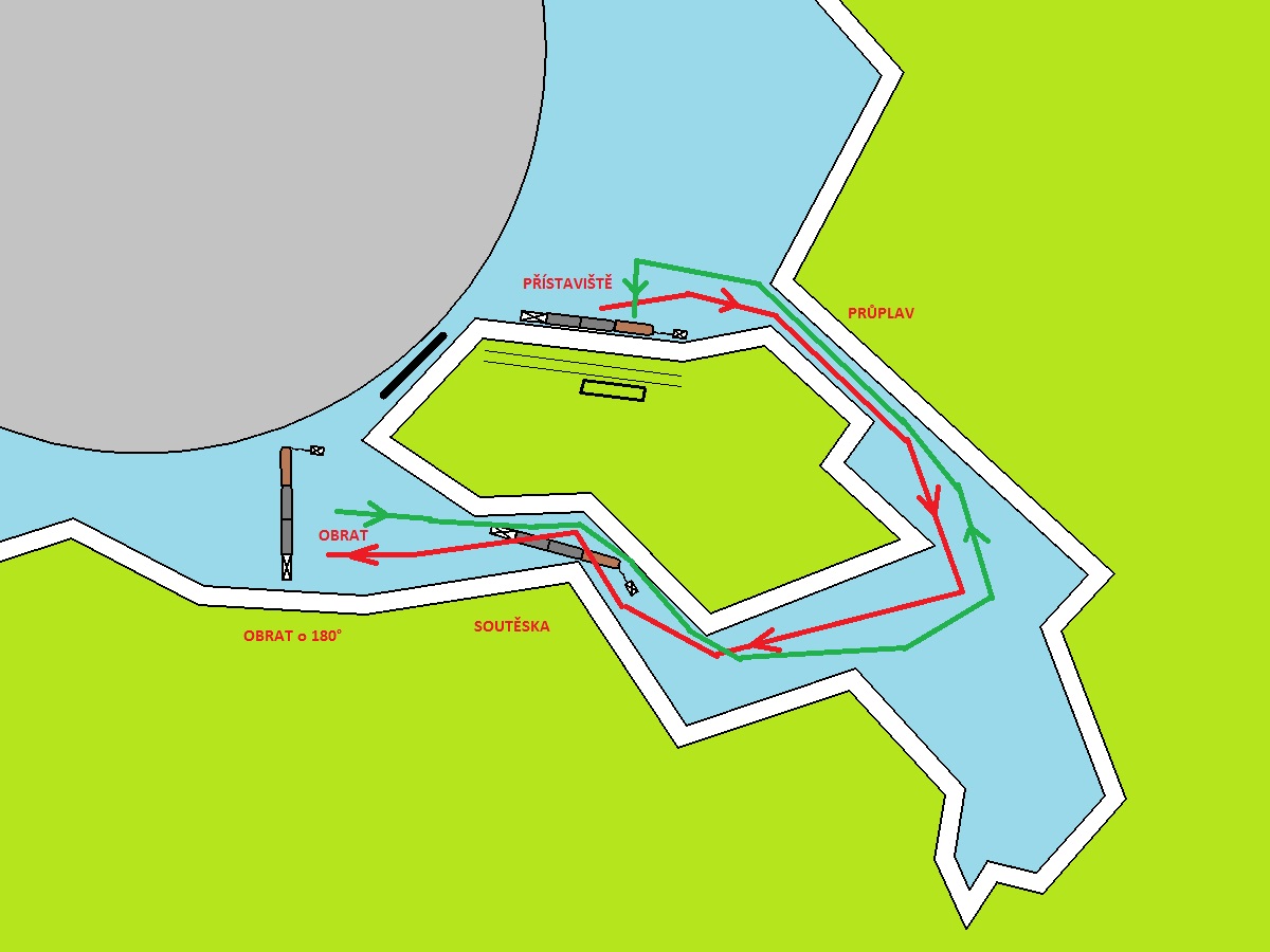 Z přístaviště soulodí vpluje do průplavu. Následuje proplutí soutěsky. Otočení soulodí o 180° (POZOR je vhodné se otáčet již v prvním bazénu, celková délka spojených van je 4,3m). Potom následuje cesta zpět. Přistání je na stejné místo, ze kterého se vyjíždělo. Špička vleku musí směřovat k průplavu. Přistáním jízda končí. Vyhraje ten, kdo bude mít v soutěži nejmenší počet trestných bodů. Při rovnosti bodů bude zohledněn lepší čas. Každý bude mít jednu jízdu na vyzkoušení (projede celou trať) a hned potom se pojede soutěžní kolo. Body budou zapisovány do zjednodušeného zápisu jízd.