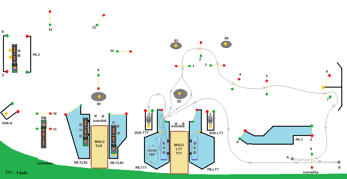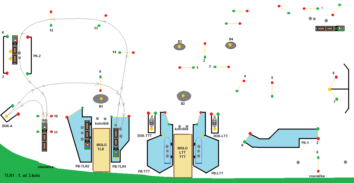 Soulodí vypluje z přístavního bazénu PB-TLR1 a propluje branky 14 – 13 – 12 a vpluje do plavebního kanálu PK-2, kde provede manévr REJDA. Po provedení manévru vypluje z plavebního knálu PK-2 a propluje brankou 10 a zahájí branku 11. Soulodí nesmí brankou 11 proplout celé. Jakmile celé propluje brankou 10, provede manévr couvání až celé soulodí vypluje z branky 10. Potom vpluje do doku DOK-A, kde se čelo soulodí musí dotknout žluté bóje, vypluje z doku DOK-A, propluje branku 9 a vpluje do přístavního bazénu PB-TLR1, kde provede přistávací manévr tak, že se záď remorkéru dotýká žluté bóje a soulodí stojí.