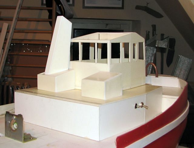 Abych zajistil v případě potřeby přístup do interérů kajuty na nástavbě, udělal jsem ji snímatelnou. K palubě je připevněna pomocí čtyř šroubů. V rozích kajuty jsou vlepeny distanční matice. Budu tak časem dodělat interiér, funkční radar a osvětlení.