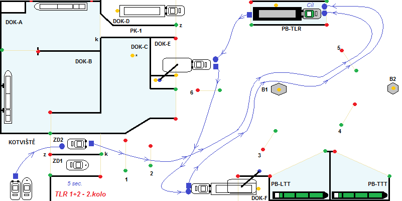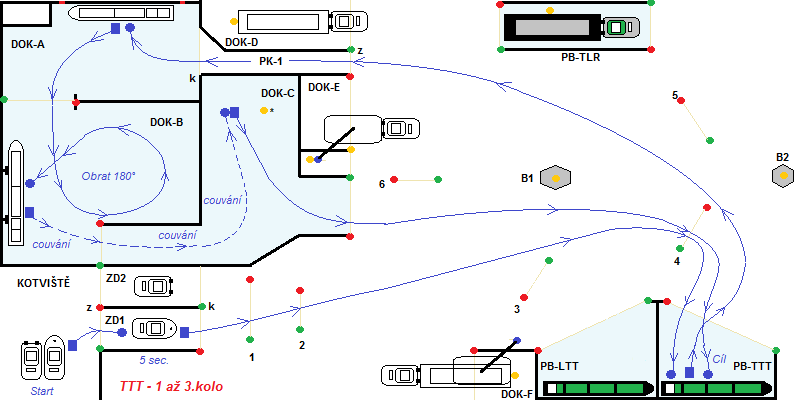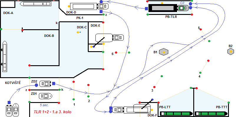 Soulodí vpluje do PK1 – DOK-A. V DOK-A provede manévr přistání mezi značky. Po provedení manévru vpluje do DOK-B, kde provede obrat o 180° a provede manévr přistání k nárazníkům. Po provedení manévru soulodí vpluje do DOK-C couváním a opustí jej opačným směrem po změně směru. Čisté proplutí DOK-C je ohodnoceno bonusem.