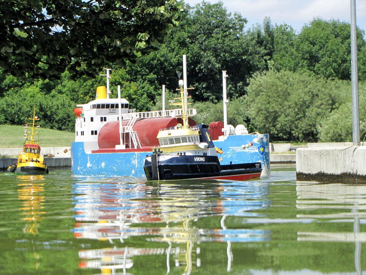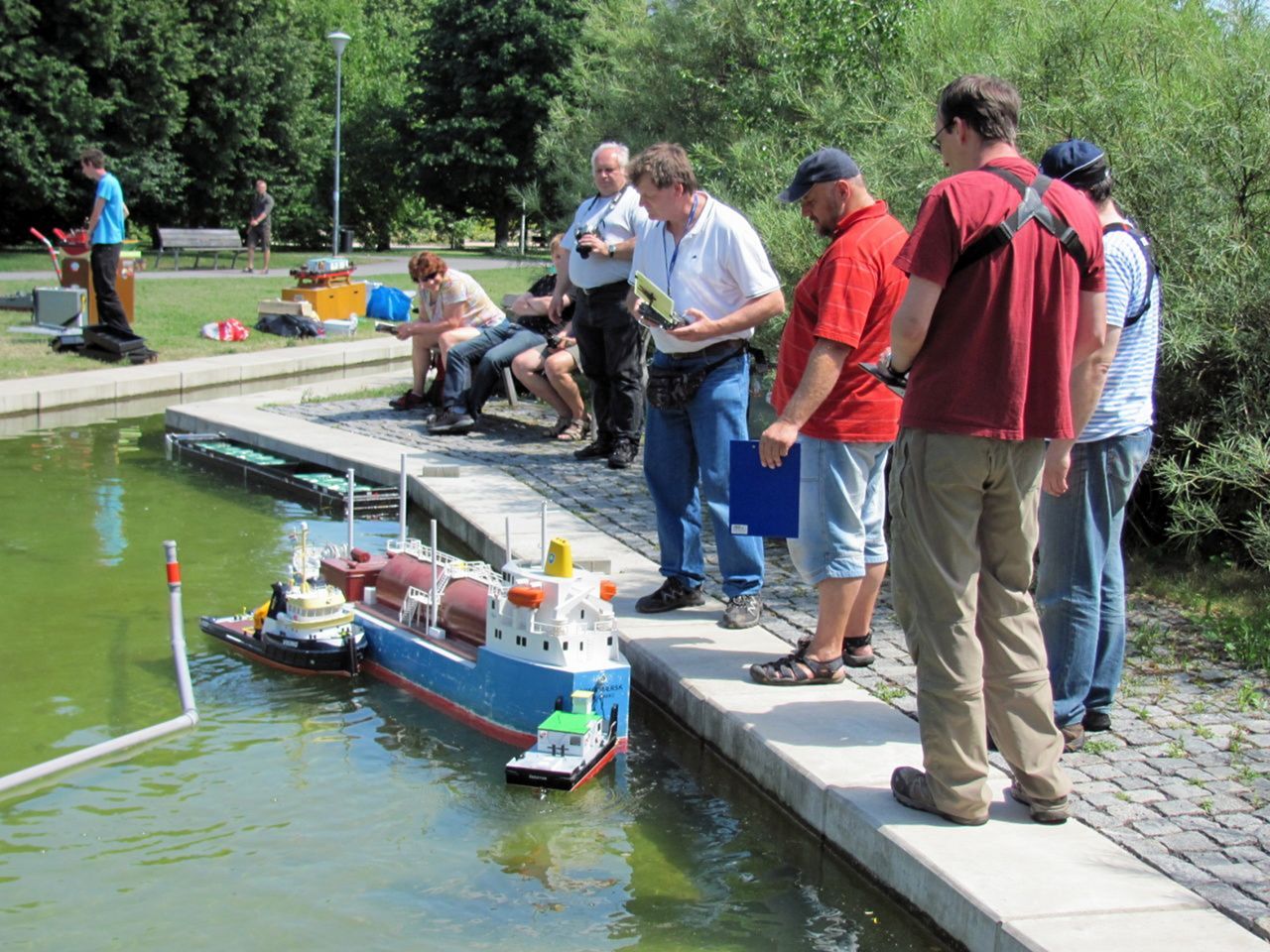 Jak bývá mým dobrým zvykem, tak jsem všechno připravil a rozkreslil dle současných standardů Tug Towingu. Účast jako obvykle byla slabší. Celkem se sešlo pět aktivních kapitánů (moje maličkost, Jarda Jungman, Ivan Červený, Luděk Rais a Roman Tyll) z kolotoče TT a dva modeláři s dalšími loděmi. Jen jako diváci překvapivě přijeli i kapitáni MSOB a MARENA z nejvzdálenějších končin odněkud Ostravska. Kluci byli obětaví a mnoha soutěžních jízd figurovali jako rozhodčí. Po obědě se také objevil Laďous, který si dokonce zasoutěžil v jednom kole tlačných remorkérů a pomohl i jako rozhodčí. Poprvé jsme do svých řad uvítali nového kapitána Michala Kadeřábka z Prahy. Jezdil s modelem Hendrix, který si koupil od Honzy Dolejška. Bohužel soutěžní kolo nedokončil, protože se mu vybila baterie a neměl náhradní. Tato nepříjemnost ho ale neodradila a stejně setrval v místě až do skončení soutěže.