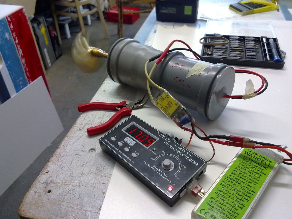 Při konstrukci pohonu se zdálo být problémem jak udělat lodní hřídel, která bude procházet přes zaplavované prostory. S Luďou jsem některé detaily trochu konzultoval a nakonec nás napadlo jednoduché řešení. Udělat to jako v modelu ponorky. Odpadlo tak mnoho složitých technických řešení. Na zádi Polymorfa tak můžete najít pohonnou jednotku, která je celá pod vodou. Dá se v případě potřeby snadno vyjmout a třeba doplnit mazivo do lodní hřídele, popř zkontrolovat zda do ní nezatéká a pod. Otáčky motoru jsou ovládány standardním obousměrným regulátorem. Nádherný čtyřlistý lodní šroub o průměru 10 cm včetně lodní hřídele pro Polymorf vyrobil Honza Červíček.