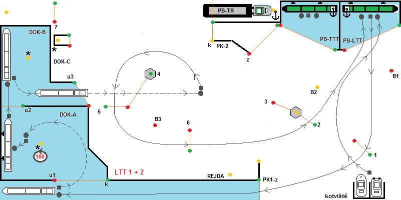 Start z kotviště. Po povelu „Příprava na start“, soutěžící kapitáni spustí remorkéry do kotviště. Po povelu START, se spustí časomíra. Remorkéry vyplují z kotviště, minou branku č.1 pravobokem a branku č.2 levobokem, B2 levobokem, B1 pravobokem a vplují do přístavu PB-LTT, kde se přiváží k vleku. Poté vyplují z přístavu, proplují brankou č.1, vplují do PK1-z. Z kanálu PK-1 vyplují couváním do DOK-A, kde je předepsán obrat 180° a následně přistání k nárazníkům. Uvnitř DOK-A je vypínač bonusových bodů. Bonus platí, od okamžiku, kdy soulodí začne vplouvat (vjezdové majáky hrají) do okamžiku, než celé soulodí DOK-A opustí (maják při vyplování hraje). Po provedeném manévru přistání, soulodí vpluje do DOK-B, ze kterého vypluje couváním. Uvnitř DOK-B je opět vypínač bonusových bodů. Dále soulodí procouvá branku č.4 . Provede změnu směru plavby a pokračuje 5-B3-6-2-B2-B1 dp PB-LTT, kde provede manévr přistání a tím soutěžní plavba končí.