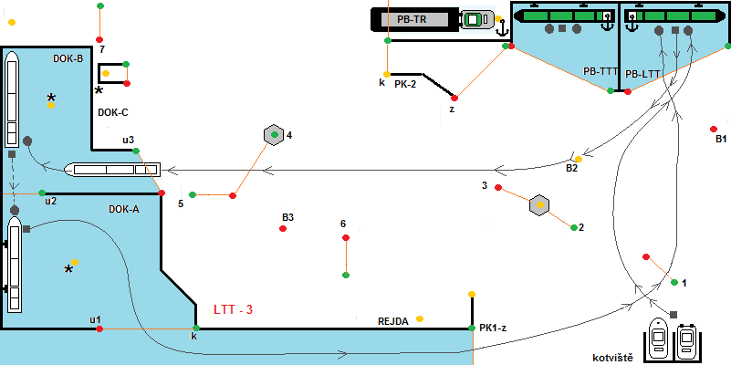 Start z kotviště. Po povelu „Příprava na start“, soutěžící kapitáni spustí remorkéry do kotviště. Po povelu START, se spustí časomíra. Remorkéry vyplují z kotviště, minou branku č.1 pravobokem a branku č.2 levobokem, B2 levobokem, B1 pravobokem a vplují do přístavu PB-LTT, kde se přiváží k vleku. Poté vyplují z přístavu, libovolně minou B2, proplují brankou č.4, vplují do DOK-B, přes u3. Z DOK-B vyplují couváním do DOK-A a následně přistání k nárazníkům. Uvnitř DOK-A je vypínač bonusových bodů. Po provedeném manévru přistání, soulodí vpluje do PK-1 přes k, vypluje přes PK-1z. Dále soulodí propluje branku č.1 a vpluje do PB-LTT, kde provede manévr přistání a tím soutěžní plavba končí.