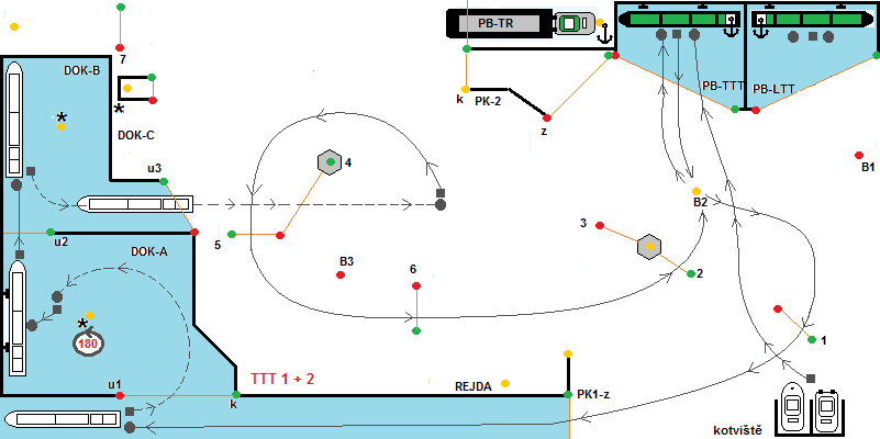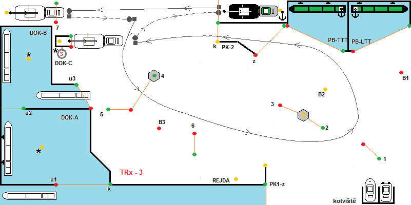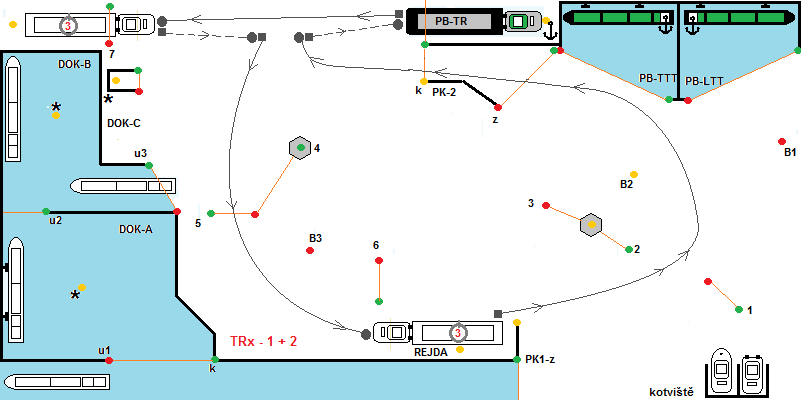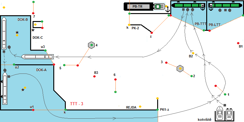 Start z kotviště. Po povelu „Příprava na start“, soutěžící kapitáni spustí remorkéry do kotviště. Po povelu START, se spustí časomíra. Remorkéry vyplují z kotviště, minou branku č.1 pravobokem a branku č.2 levobokem, B2 levobokem, B1 pravobokem a vplují do přístavu PB-TTT, kde se přiváží k vleku. Poté vyplují z přístavu, libovolně kolem B2, B1 levobokem, proplují brankou č.1, vplují do PK1-z. Z kanálu PK-1 vyplují couváním do DOK-A, kde je předepsán obrat 180° a následně přistání k nárazníkům. Uvnitř DOK-A je vypínač bonusových bodů. Bonus platí, od okamžiku, kdy soulodí začne vplouvat (vjezdové majáky hrají) do okamžiku, než celé soulodí DOK-A opustí (maják při vyplování hraje). Po provedeném manévru přistání, soulodí vpluje do DOK-B, ze kterého vypluje couváním. Uvnitř DOK-B je opět vypínač bonusových bodů. Dále soulodí procouvá branku č.4 . Provede změnu směru plavby a pokračuje 5-B3-6-2-B2-B1 dp PB-LTT, kde provede manévr přistání a tím soutěžní plavba končí.