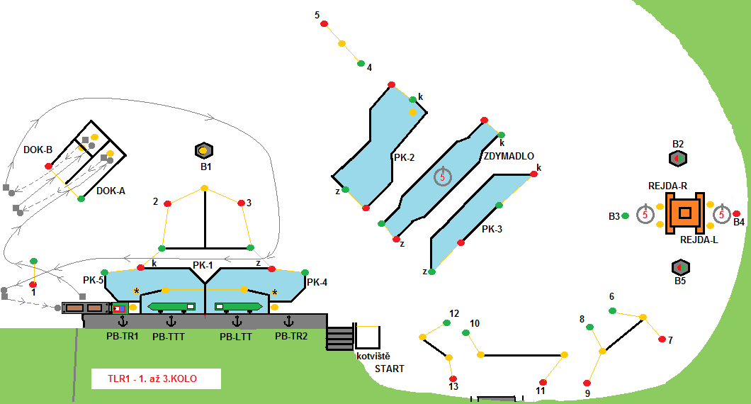 Remorkéry startují z kotviště, proplují PK-1 – PK-5 do PB-TT. Přiváží se k vleku. S vlekem z PB-TT vycouvají, couváním proplují PK-5. Dojde ke změně směru a soulodí pokračuje 2 – B1 pravobokem – 5 – B2 pravobokem – REJDA-L (trvání 5 sec.) – B4 levobokem – B5 pravobokem – 7 – 9 -11 – 13 – ZDYMADLO (trvání 5 sec.) – 5 – 2 – PK-5 s bonusem (-3 b.) – PB-TTT kde plavba končí .Bonus se uplatní pokud soulodí propluje PK-5 a PB-TTT bez trestného bodu a nektivuje vypínač.