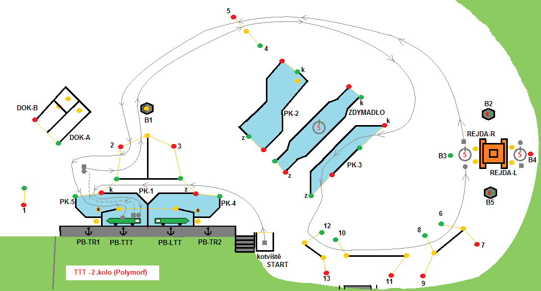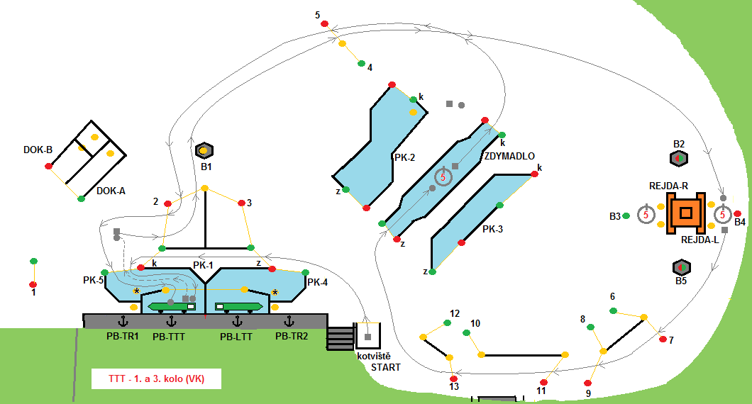 Remorkéry startují z kotviště, proplují PK-1 – PK-5 do PB-TT. Přiváží se k vleku. S vlekem z PB-TT vycouvají, couváním proplují PK-5. Dojde ke změně směru a soulodí pokračuje 2 – B1 pravobokem – 5 – PK-3 – 12 – 10 – 8 – 6 – REJDA-R (trvání 5 sec.) – B3 levobokem – B2 pravobokem – 5 – 2 – PK-5 s bonusem (-3 b.) – PB-TTT kde plavba končí .Bonus se uplatní pokud soulodí propluje PK-5 a PB-TTT bez trestného bodu a nektivuje vypínač.