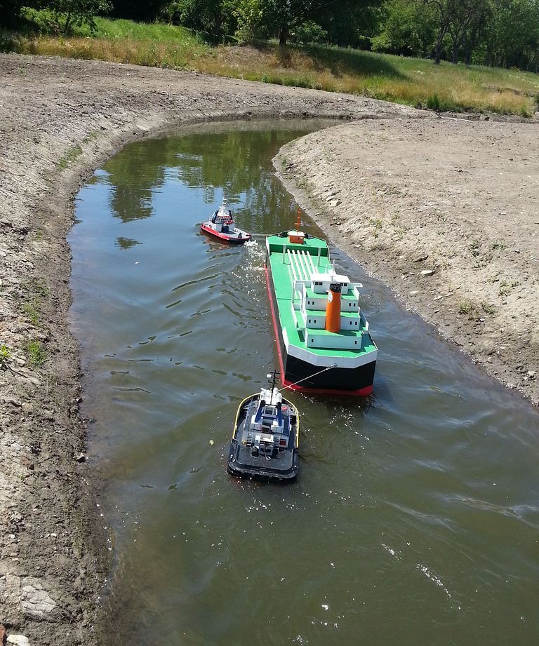 Na druhou červencovou sobotu, Robert pozval příznivce tug towingu na pohodové plavení v korytu potoka Rokytka v Praze. Nebyl jsem si jistý zda dorazím vzhledem k technickému stavu Vitouše, ale nakonec se zadařilo, naložil jsem Velkého Kačera, Monako III, sebe a vzhůru do Prahy! Místo, které Robert objevil bylo skvělé. Právě rekultivovanou planinou se klikatilo šesti zatáčkami koryto potoka v délce přibližně 150m s šířkou kolem dvou a půl metru. Na dolním toku byla větší tůň, na horním toku odbočující slepé rameno. Proud se nám zdál poněkud silnější, než Robert avizoval ve své pozvánce, ale ukázalo se, že to půjde taky. Trochu problémy nám činila hloubka slepého ramene. Zjistili jsme, že některé remorkéry do něj neproplují. Bohužel se mi nepodařilo přesvědčit přítomného bagristu aby nám dno trochu proškrábl. 🙂 V korytu žádné překážky nebyly. Pouze na horním toku trubky vymezovaly mělčinu a na dolním toku byl přístav a před ním jedna branka a červená bóje.