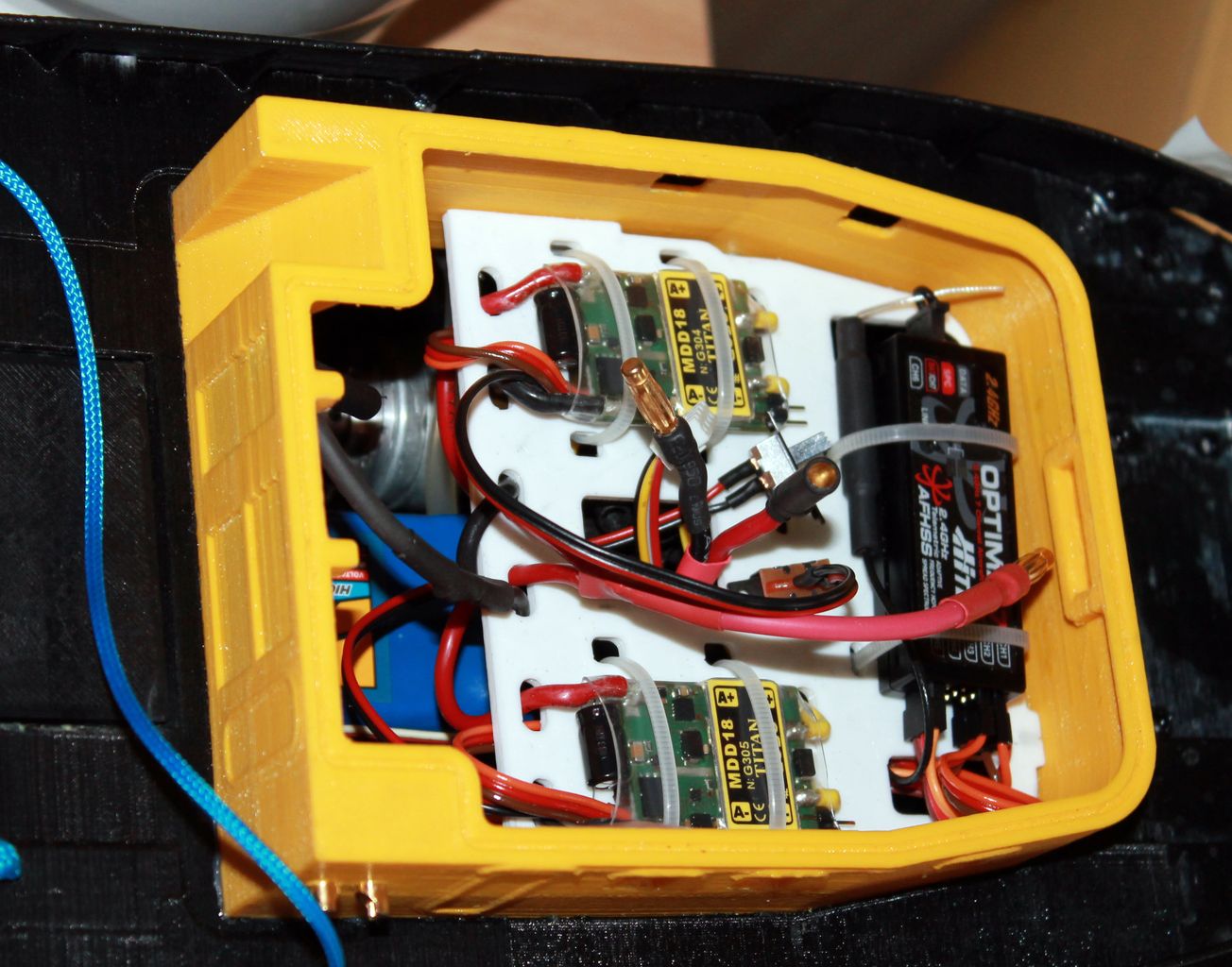 Pohled do útrob remorkéru Error Printing kpt. Ondry Slavíka. Kromě elektronických součástek je i vnitřní dělení a pod součástí 3D tisku. Nic není vlepováno.
