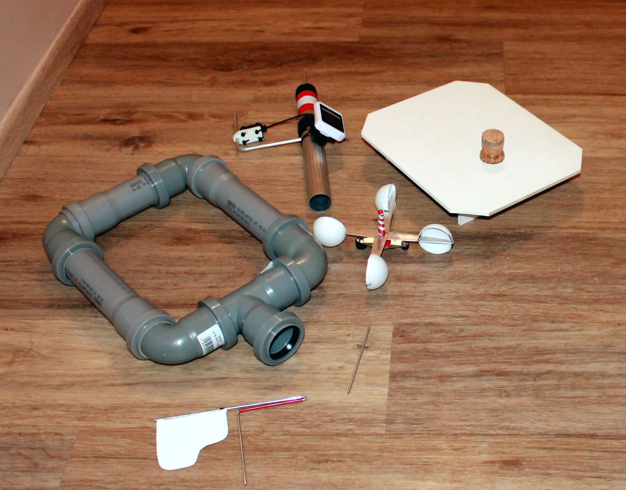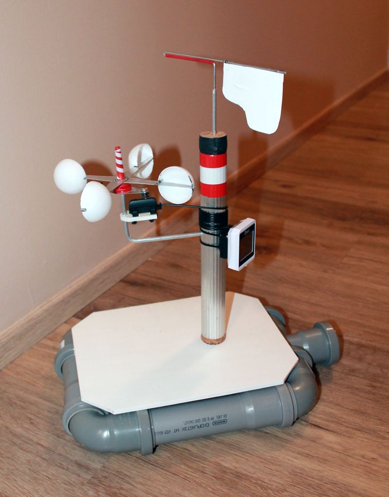 Základ tvoří duralová trubka z vyřazené zahradní solární lampičky a hliníková trubička ohnutá do tvaru písmene „L“. Větrné lopatky jsou udělány ze dvou míčku na ping-pong a hliníkového plechu. Jako ukazatel síly větru slouží cyklocomputer, který jsem kdysi dávno koupil v Lídlu asi za 200,- Kč. kromě rychlosti navíc měří i aktuální teplotu a čas. Zaznamená i maximální rychlost. Přepočet rychlosti větru z km/h na m/s je velmi snadný. Na sílu větru se dá snadno usuzovat z rychlosti otáčení lopatek. Ložiska jsou sice jen kluzná, ale pohnou se i při nejslabším vánku a cyklocomputer zaznamenává rychlost s přesností na desetiny km/h. Více než dostačující.