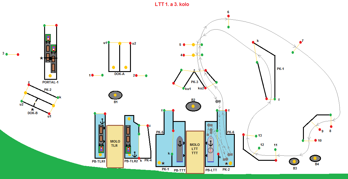 Těsně před soutěží alespoň plánky tratí. Vzhledem k předpovědi počasí jsem navrhl jednoduché a kratší tratě s jedním složitějším manévrem. Pro tlačné remorkéry jsou dvě nové překážky. jedna s jeřábem a druhá s nákladní vanou. Snad se budou líbit. Vlečné remorkéry mají náročnější přístav, kde se dají nasbírat body již při vyplování z přístavu. Samozřejmě nechybí ani bonusy! Přepřahání vzhledem k místním podmínkám jsem raději vynechal.
